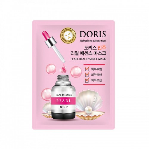 Тканевая маска для лица с экстрактом жемчуга Doris Pearl Real Essence Mask пропитанная эссенцией, обогащенной экстрактом жемчуга и комплексом питательных веществ, помогает выровнять цвет лица, а также осветлить пигментные пятна и веснушки.